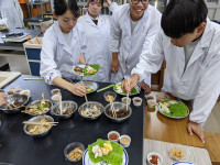 10月31日(木)食品デザイン科実験班がサルチャのアンケートをもとに、メニュー開発を行いました。まず、生産科学科が栽培した「にこまる」と大洲の特産干しシイタケ、里芋を使ったサルチャピラフ。次に、サルチャとヨーグルトを合わせたディップソースにグリルした肉や魚をつけてみました。デザートはリンゴとサルチャのヨーグルトサラダです。どれもおいしくてどんどんアイデアが湧いてきました☆